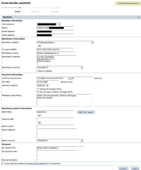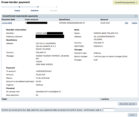 This example is from a Finnish web bank, provided by Nordea Finland. I acted as if I was paying for my Crown Tourney reservation from abroad and the system is stupid enough not to suggest that I do it as a domestic payment (which is faster and easier). Thus I got an